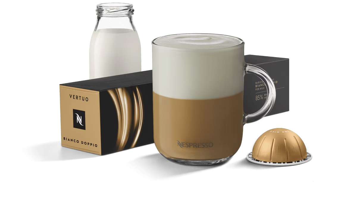 With milk, Bianco Doppio has a sweet profile, with fruity, biscuity, and cereal notes and a creamy texture.